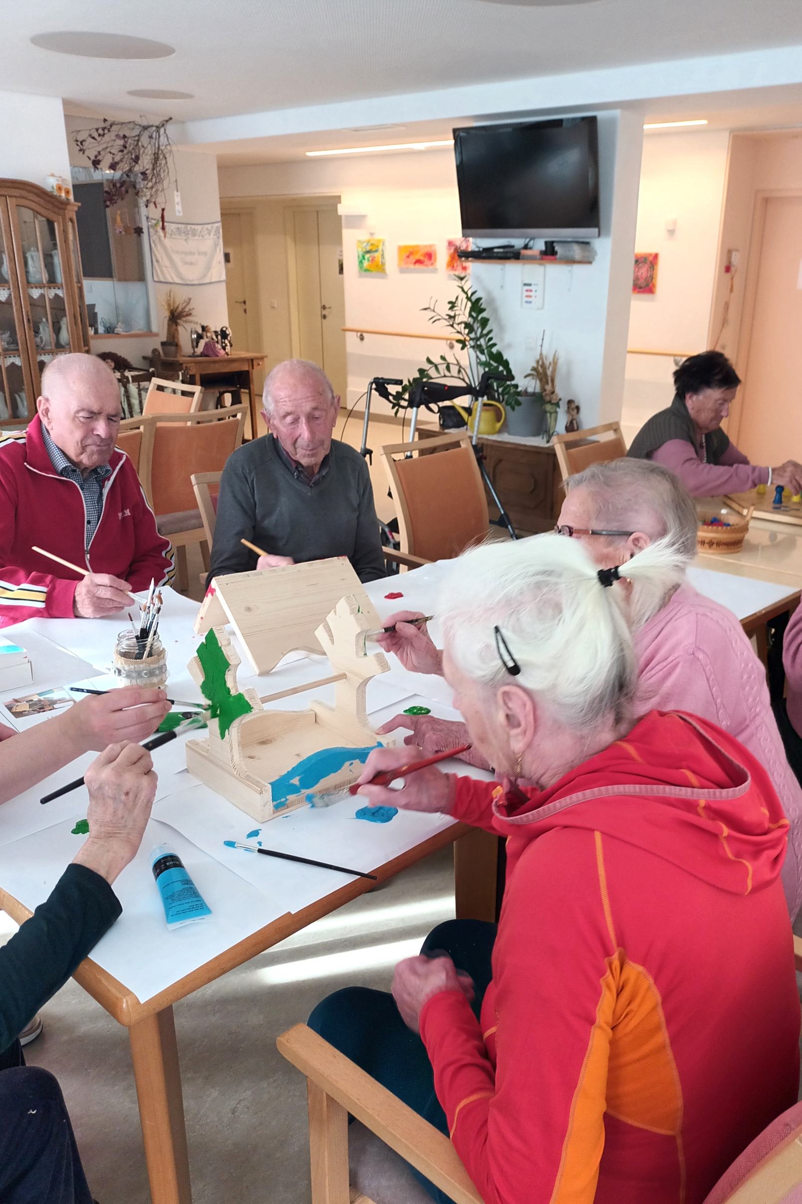 Auch die Vogelhäuser aus Wagrain und Hüttau zeugten von großer Kreativität und Gemeinschaftsgeist. Im SeneCura Sozialzentrum Wagrain entstand ein liebevoll gestaltetes Vogelhäuschen in echter Teamarbeit: Bewohner Anton Mühlbacher übernahm den Zusammenbau, während Sieglinde Pitter mit viel Sorgfalt den Anstrich gestaltete – ein kreativer Beitrag zur Natur und täglicher Blickfang für Bewohner:innen und Besucher:innen. In Hüttau wurde ebenso mit vereinten Kräften am Bau und der farbenfrohen Gestaltung des Vogelhauses gearbeitet. Traudi und Maria Althuber, Christine Lanner, Maria Heigl und Sigbert Deutschmann, Johann Breitfuß, Steffi Kaltenegger und Rupert Lackner sorgten für das bunte und fröhliche Design des Vogelhauses, voller Frühlingsstimmung.