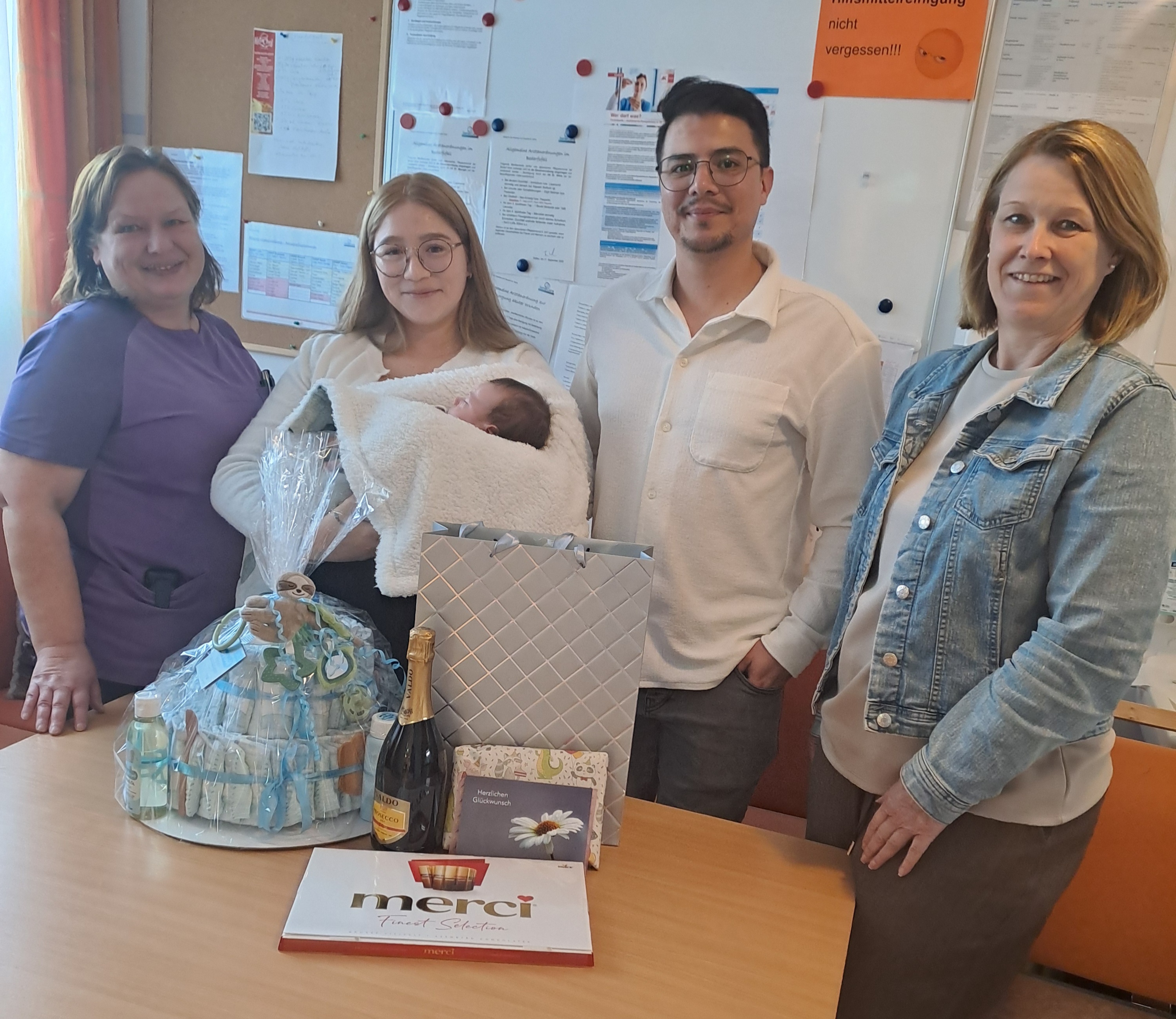 Im März durften sich unsere kolumbianischen Mitarbeiter:innen Paola und Jeison, beide Diplomierte Gesundheits- und Krankenpfleger, über die Geburt ihres Sohnes Emiliano freuen. Pflegedienstleitung Monika Auer und Hausleitung Birgit Baier überbrachten im Namen des SeneCura Sozialzentrums Hüttau sowie des gesamten Teams die herzlichsten Glückwünsche an die frisch gebackenen Eltern. Das gesamte Team gratuliert ebenfalls sehr herzlich und wünscht der jungen Familie alles Gute für die gemeinsame Zukunft.